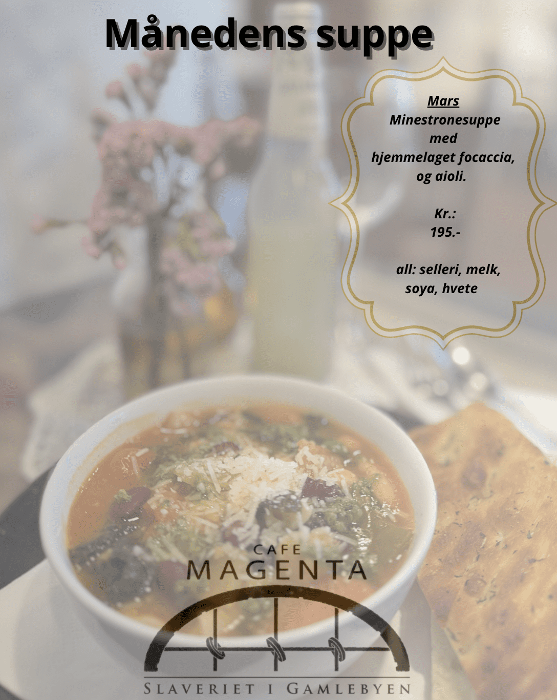 Denne måneden serveres en nydelig og smaksrik minestronesuppe med hjemmelaget focaccia og aioli og et dryss parmesan på toppen Kr.:195.- (allergener: selleri, melk, soya, hvete)